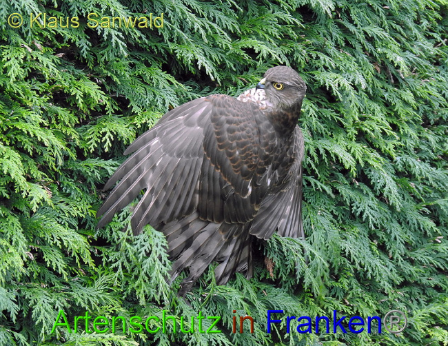 Versucht sich einen Kleinvogel an den Vogelfutterstellen zu holen.Der Greifvogel aus der Familie der Habichtartigen ist ein sehr geschickter Jäger.Die früheren starken Nachstellungen und die Bejagung hat er überlebt und zählt inzwischen zu den streng geschützten Vogelarten.