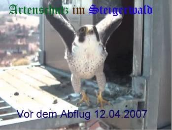 Kurz vor dem Abflug, höchst interessante und für die Wanderfalken vollkommen störungsfreie Bilder liefern uns die speziellen Kameras. Dieses Equipment wird von den Greifen als "zum Nistplatz" dazugehörend" wahrgenommen.