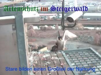 Der Nahrungsbedarf steigt ständig. Permanent versorgen die Wanderfalkeneltern ihren Nachwuchs mit Nahrung, wobei hauptsächlich Stare erbeutet werden, was die Fotos sehr gut dokumentieren.