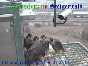 Wie die "Orgelpfeifen" stehen die jungen Wanderfalken bereit um die Nahrung von Wanderfalkenvater mundgerecht serviert zu bekommen, denn in der Lage selbständig Nahrung zu zerlegen sind die Tiere noch nicht.