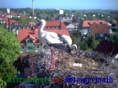 Was machen die Störche am 03.Mai 2008? Sie brüten und bringen das Nest in Ordnung.