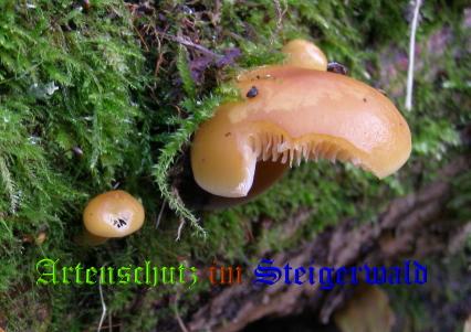 Nicht selten wächst er auch hoch oben. Mitunter wird seiner honiggelber Hut bis 12 cm breit (allgemein kleiner), in der Mitte ist er dunkler, fuchsrot oder bräunlich. Die Lamellen stehen weit und sind mit kürzeren untermischt.