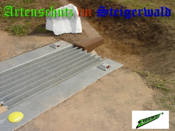Letzter Halt vor dem Straßentod -- eine "Amphibienstopprinne" ist hierbei eine wertvolle Hilfe Leben zu retten. Wobei der Name Stopprinne etwas irreführend erscheint, handelt es sich vielmehr um einen Amphibieneinfall- bzw. Amphibienquerungsschacht.