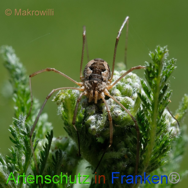 Bei Weberknechten sind Vorder- und Hinterkörper miteinander verwachsen, so dass ihr Körper sehr kompakt und kugelig wirkt. Die Augen befinden sich erhöht auf kleinen Hügelchen. Dieses Weibchen hat eine Körperlänge von 6 - 7 mm.